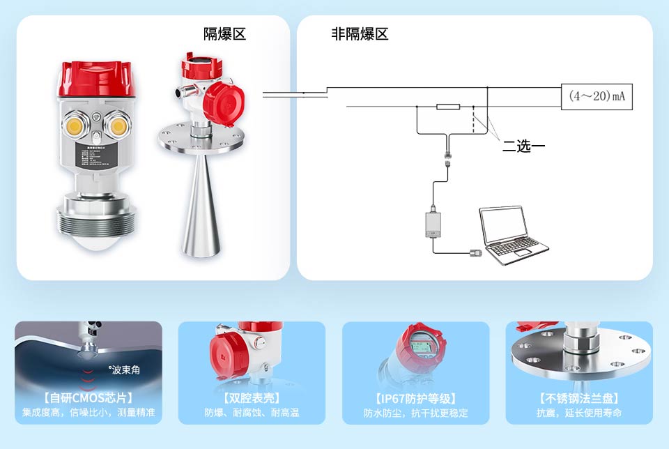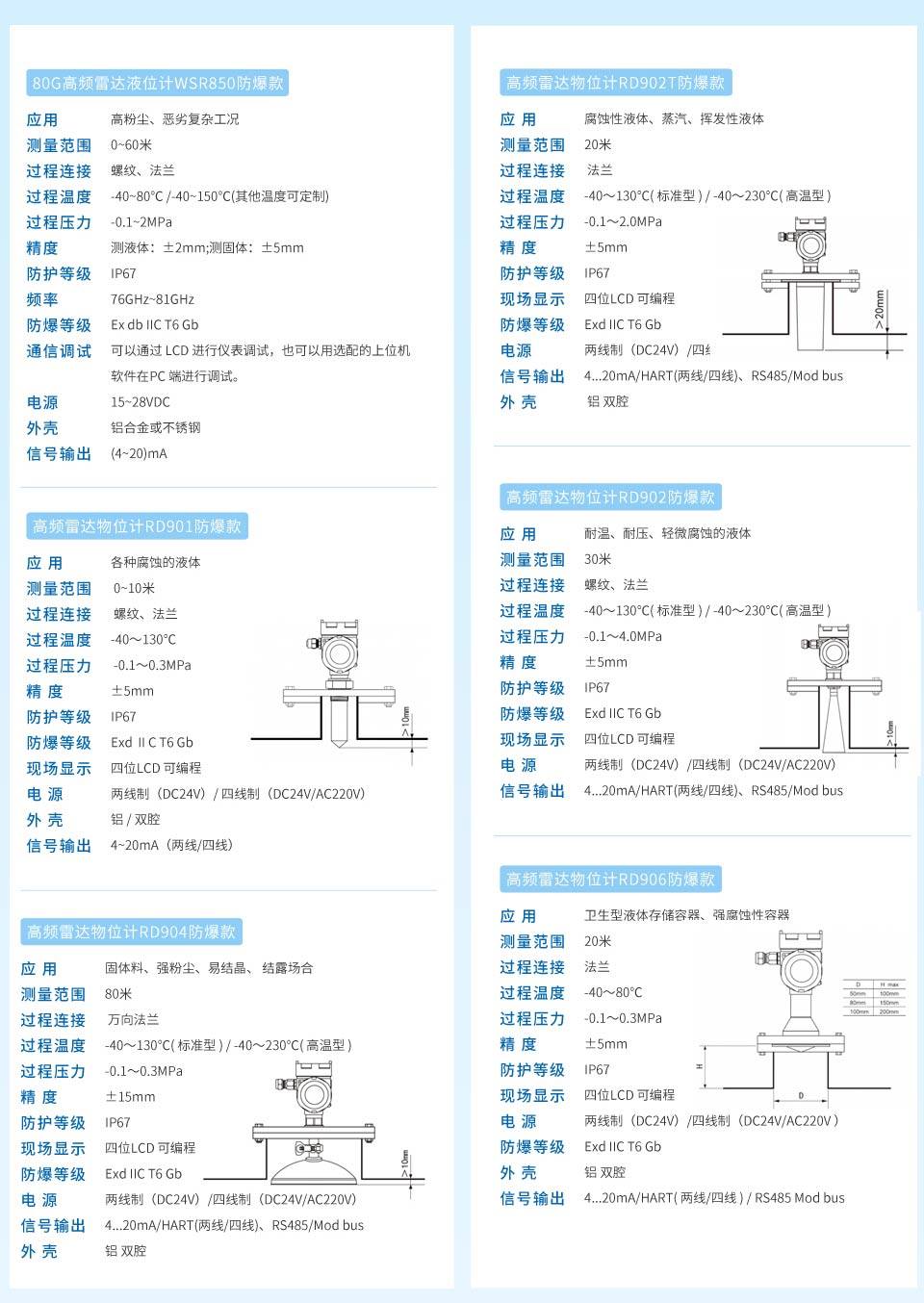 產品描述:80G高頻防爆雷達液位計工作頻率更高,波長更短,所以尤其適合固體應用,通過透鏡發射接收電磁波的工作方式,在高粉塵,惡劣溫度環境下具有獨特的優勢。儀表提供法蘭或者螺紋的連接方式,使得安裝便捷簡易。